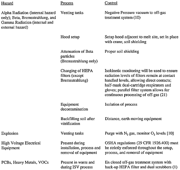 Engineering Controls: Exposures to radionuclides, VOCs, and heavy metals will be minimized by various control methods. An additional hood, attached to the off-gas treatment system, will be set up over the unvitrified portions of the tanks requiring more than one set. Upon setup, the ISV process will be carried out by employees in an isolated control trailer. After initiation of the melt, employees will only come near the melt to replenish the electrode feeds (when applicable) (1). Control techniques for major hazards are summarized in Table III. In addition, a site safety and health plan, as outlined in OSHA 1910.120, and "worst case" shielding calculations for beta, gamma, and Bremsstrahlung radiations (2-9) for Tanks 1-4 before and after remediation, will be available during operations.