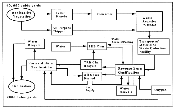The harvesting process uses five major pieces of equipment: a feller/buncher with a shear type cutting head that cuts down trees and leaves them in bunches, a forwarder that collects the tree bunches and hauls them to a central location, an all-purpose chipper that chips smaller vegetation and hauls it to a central location, a waste recycler that grinds the waste, and trucks with trailers that gather the waste and haul it to the volume reduction facility. The volume reduction process uses reverse burn gasification to trap the radionucleotides contaminating the waste in a triple reverse burn char matrix, a low grade activated carbon. This char material absorbs the radionucleotides and prevents them from escaping the reactor while the remaining waste is reduced to ash. Gasification, a versatile process that can be used on radioactive sludges, liquids and contaminated soils, reduces the volume to approximately 2% of the original waste. After the volume reduction a simple process such as cementation will be used, which will increase the volume to only 5% of the original waste, or vitrification which is a viable alternative can be used as a final stabilization step that can be done cost effectively at the facility.