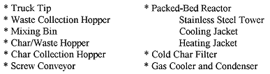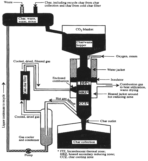 The material is mixed continuously and sent to a char/waste hopper where it enters the gasifier. From the char waste hopper material enters the column at 50 tons per hour and oxygen is added at 250 ft3/min at the top. The gasifier can be seen in greater detail in Fig. 2. As it moves through the gasifier the char/waste mix first encounters the cooling zone which is surrounded by a cooling water jacket to keep the material from igniting prematurely. When the material exits the cooling zone, it enters a small insulated perimeter before entering the incandescent thermal zone, the ITZ. In the ITZ which is a stationary flame front, the char/waste mix is ignited. The material then leaves the ITZ and enters the heated secondary reducing zone, the HRZ. A heating jacket surrounds both the ITZ and the HRZ and is created by burning the off gases from the process in an insulated jacket around a portion the packed-bed tower. After leaving the HRZ the mixture enters the char cooling zone.(16)