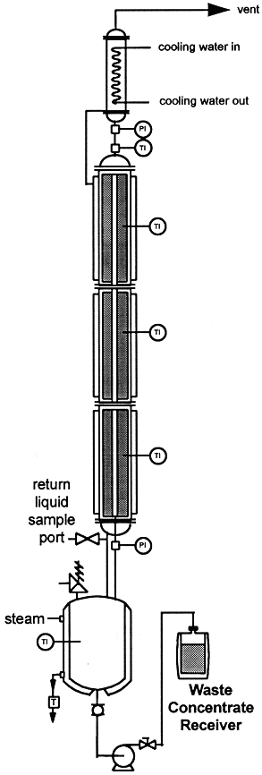 At start-up, vapor from the reboiler travels to the top of the column through the percolating pipe that runs through the center of each loading cell. The vapor then condenses onto the packed vegetation bed. As the condensate trickles down through the packed bed of vegetation, the highly water soluble radioactive chlorides are transported down the column in the direction of the reboiler. The extracting effect of the condensate moving down through the column is enhanced by heat from the percolating pipe in the center of the column. The heat causes a refluxing of the condensate increasing the time a given volume of water spends in the column. This effect increases the amount of contaminated vegetation a given quantity of water will contact, thus increasing the salt concentration of the liquid returning to the reboiler.