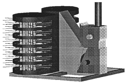The processing unit is illustrated in Fig. 3. The flora (contained in loading cells) is placed in a percolating column. The loading cells are designed such that they have an annular region that contains the flora to be treated, and a pipe through the center that creates a path for steam travel to occur from the reboiler to the top of the percolation bed. The top and bottom plates of the loading cells are distribution plates, designed to provide for redistribution of the liquid condensate over the vegetation beds. The bottom of each loading cell has supports preventing it from resting directly on the top plate of the cell beneath (to prevent blockage of liquid flow through the column).