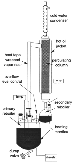 A second major difference between the prototype and the proposed commercial unit is due to the relatively small size of the prototype column diameter that precludes operation with an internal percolator. Thus, the steam riser was located external to the vegetation bed. To maintain the steam riser temperature and thereby allow the vapor to rise to the top of the column, the riser was wrapped with heat tape and set to maintain the glass tube walls at 100°C. The prototype percolating bed was jacketed with hot oil rather than insulated. This is to allow for visual inspection of the condensate flow pattern.