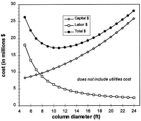 Capital costs associated with the column were estimated by standard techniques. (4) based on the weight of the column. Purchased costs of the other major units (reboiler, grinder, pneumatic conveyor and crane) were estimated and Lang factors were applied to estimate the installed capital investment. Capital cost is sensitive to operating pressure (shell thickness, thus weight is proportional to internal pressure). An operating pressure of 100 psig was selected for the purpose of this analysis.