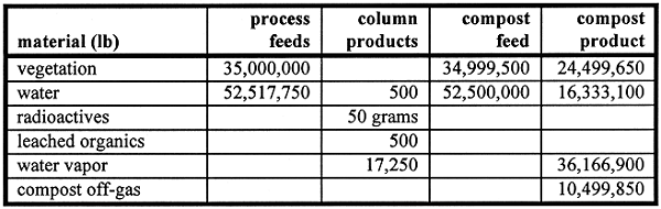A material balance performed for the process is provided below in Table I. Column products are those flows that are not passed on to the composter. Water vapor refers to that water that is boiled off the vessel for volume reduction prior to the final waste product drumming, or is lost to the atmosphere in composting.