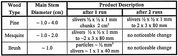 A test was conducted using a commercial chipper/shredder to determine typical particle size of processed fresh vegetation. The chipper/shredder was rated to process limbs up to 3" in diameter. The feed for the test consisted of freshly cut pine branches varying from 1 to 4 cm in diameter, mesquite wood to simulate hardwood, and various brushes. The wood types were processed separately and then combined to form a mixture of approximately 60% pine, 20% mesquite and 20% brush by volume. A qualitative summary of the test results is given in Table II.