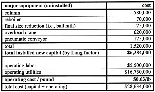 Utility costs dominate the direct costs of the percolating column operation. However, the utilities costs are roughly proportional to the fixed mass of vegetation being treated, and therefore did not contribute to the optimization between capital and direct costs and could therefore be determined separately. HALFLIVEs assumed for the calculation that one pound of water would have to be vaporized for every four pounds of vegetation being treated. With proper insulating and heat recovery from the vapor riser, it is expected that this ratio will allow the mass to be contacted by 16 lb of steam per lb of flora.