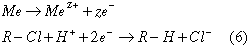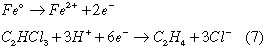 While zinc, tin, and iron successfully dechlorinated several compounds, magnesium reactions were found to be overwhelmed by the competing reaction of oxidation by water. (Boronina et al. 1995). One example of a proposed mechanism for iron on trichloroethylene is as follows (Matheson and Tratnyek, 1994).