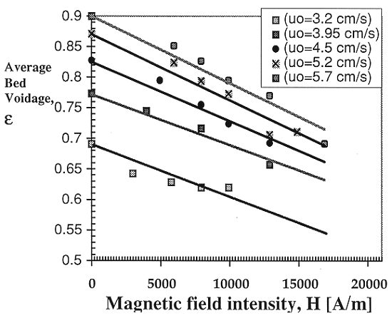 In the correlation, the bed porosity, e, is shown as a function of the magnetic field intensity and ferromagnetic properties of particles, as derived from the original experiments of Honorez (1994), and Jovanovic and Honorez (1994)