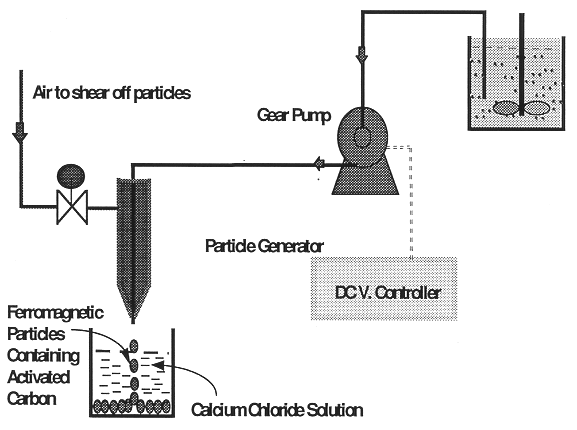The preparation and production of the alginate particles is a simple, straightforward process. The design schematic for preparation and production of the particles is shown in Fig. 3. Typically, a solution of 2% sodium alginate in water, ferromagnetic powder, and either granulated activated carbon, ion exchange resin, zinc powder or iron powder is mixed in a vessel. The solution is pumped by a gear pump through a nozzle. As shown in Fig. 3, air is supplied through the outer cylinder to shear off the particles from the tip of the nozzle. This helps to ensure desired size of particles. Once a particle is sheared off, it drops into a 1-2 M solution of calcium chloride. The alginate exchanges two Na+ ions for a Ca2+ which immediately creates the protective "skin" of the particle. The particles are left in solution for a short period of time which is a clear distinction from other known particle manufacturing processes (Klein et. al., 1983). The core of the particle is usually left in liquid state. Both the alginate and the activated carbon or ion exchange have strong adsorptive properties for organic and polyvalent metal ions. The flexibility in the amount of time that the particles spend in the calcium chloride provides us with the capability to control polymerization of the alginate and indirectly the diffusivity of different molecular compounds through the bead.