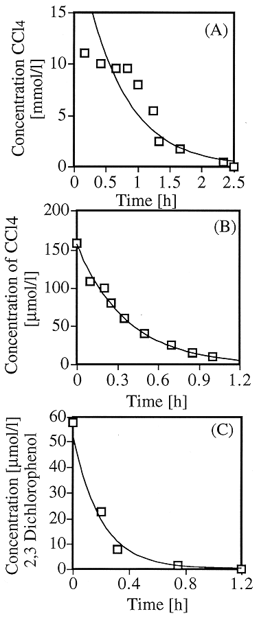 Importantly, these researchers have worked at near groundwater temperatures (15-25[°C]) and at low concentrations of these environmental contaminants. These conditions are in agreement with the aims of our technology towards the treatment of contaminated soil and sludge materials. Further, we opt to design a platform upon which to combine the dechlorination chemistry with our carrier alginate beads. The metal powders used can be easily incorporated into our alginate carrier. The alginate solution itself is approximately 98% water. Diffusion coefficients for solutes in alginate beads have been reported as having the same magnitude as aqueous diffusivities (Oyaas et. al., 1995). Therefore, it is expected that the diffusion into the alginate bead and subsequent reaction would be on the same order of magnitude as in the batch experiments described in literature.