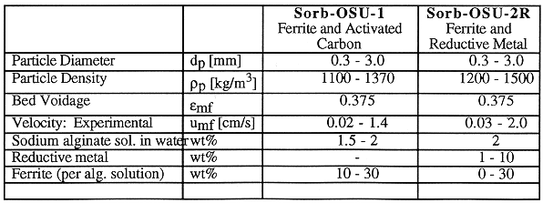 The basic fluidization particles used in MSFB are composite ferromagnetic particles which are made from the mixture of sodium alginate and ferromagnetic powder. Further, the content of the particles can be modified to fit our purposes. In the process of adsorbing the contaminants in a slurry, activated carbon, ion exchange resin, elemental iron or zinc are added into the alginate particles to form OSU-Sorb-1 and OSU-Sorb-2R types of particles. The activated carbon serves as an adsorption site for the organics while ion exchange resin collects metal ions. Elemental (zero valent) zinc or iron serve as electron donors in the process of reductive dechlorination. The individual bead characteristics are shown in Table I.