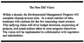 The new vision and Ten-Year Plan are guiding strategic thinking and decision making. The Plan will serve as a baseline to monitor progress throughout the next decade. Each EM site is currently developing a Ten-Year Plan, which collectively will make up the EM Ten-Year Plan. The EM Ten-Year Plan will provide a cross-cutting program view.