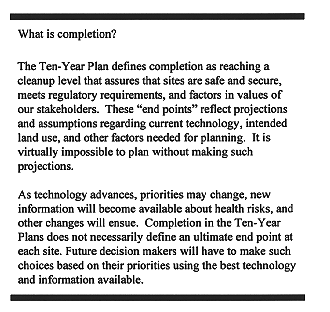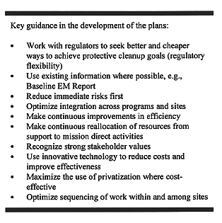 The Ten-Year Plan, when complete, will consist of the "EM Ten-Year Plan," supported by individual site ten-year plans containing detailed project data. The site plans are being developed entirely by the field. The field is challenged to use "break-through thinking" to perform and complete work more efficiently - to do more with less. Strategies are being developed which accelerate mission accomplishment, reduce support and other non-value added costs, and sequence projects to reduce risks and long-term cost liability or "mortgage".