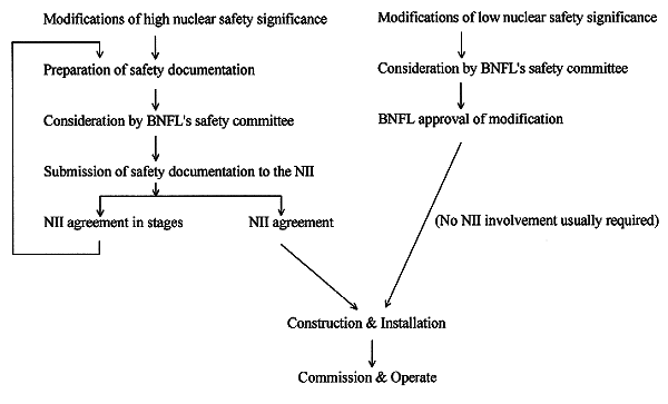Modifications which are categorized as having a higher nuclear safety significance are controlled by BNFL in a different manner and can not be implemented without the involvement of the NII. The amount of regulatory involvement which the NII decides to impose depends upon its view of the safety significance of the modification. For these higher category modifications BNFL are required to produce formal safety cases and submit them to the NII before the modifications can start.
