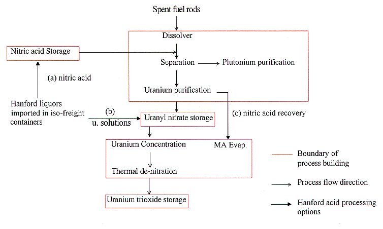The uranyl nitrate solutions were to be discharged into uranyl nitrate storage tanks located adjacent to the reprocessing plant (b). These tanks store uranyl nitrate solution for subsequent conversion to uranium trioxide powder; however, they are also used as stock tanks for the recycling of uranyl nitrate back into the reprocessing plant to maintain flowsheet conditions. BNFL's proposal for the 'Hanford' uranyl nitrate was to feed the liquor to the uranium purification stage of the reprocessing plant and generate a solution at the appropriate acidity and concentration for conversion to powder. As the effect of introducing additional uranium into the process during normal operations would have displaced reprocessing throughput, BNFL proposed to co-process the 'Hanford' liquors during periods of reduced throughput. BNFL also proposed to recover the nitric acid arising from the Hanford solutions (c).