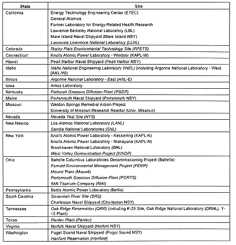 Table I Sites Considered in the Residuals Analysis Project (sites shown in italics were evaluated for their disposal capabilities in the performance evaluation project (3)