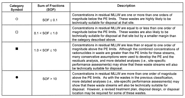 Depending on the result of the calculations in Eq. 3, each waste stream was placed into one of four categories for the fifteen DOE sites. These categories are summarized in Table II.