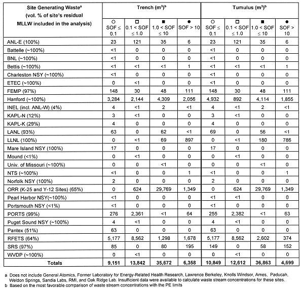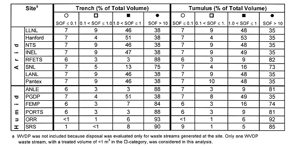 In Table IV, the combined volumes of waste are generally shifted slightly to the left (i.e., to more technically acceptable disposal combinations) for the tumulus design compared with the trench design, indicating the slight additional performance gained by using the tumulus design. The additional benefit from using a tumulus design instead of a trench design is small because the best technical combinations of waste streams and disposal sites for both facility types typically represent disposal at more arid sites; these sites generally do not benefit from using more engineered disposal facilities. At disposal sites in the humid region of the country, the additional performance gained by using a more engineered disposal facility design would be greater; more engineered disposal facilities are used at ORR and SRS for disposal of low-level waste.