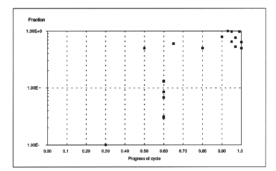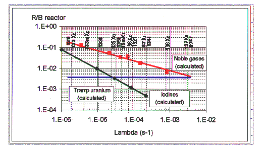 The values of source terms for these mechanisms can be obtained from the analysis of the reactor coolant gamma isotope data during the cycle. The nuclides analyzed are the rare gases ( 85mKr, 87Kr, 88Kr, 133Xe, 135Xe, 138Xe) and the iodines (131I, 133I, 134I, 135I). From the measured activities and reactor parameters (power, CVCS flow rate), it is possible to calculate the fractional release of these nuclides in the primary water (Fig. 1) and to deduce: