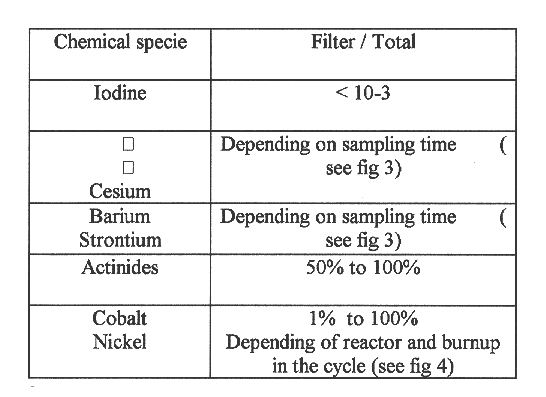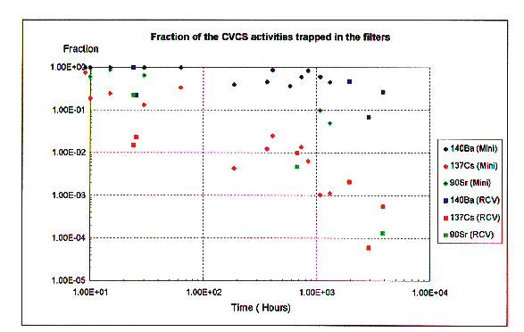 From the solubility factors in Table I it seems very easy to deduce the percentage of the activity which is trapped in the CVCS filter and resin. This is true for the actinides which are very insoluble, chemical species. However, for the species which are totally or partially soluble, adsorption of the soluble part may occur on the filter. The adsorbed fraction depends on the chemical form of the radionuclide and is often variable with the filtration time.