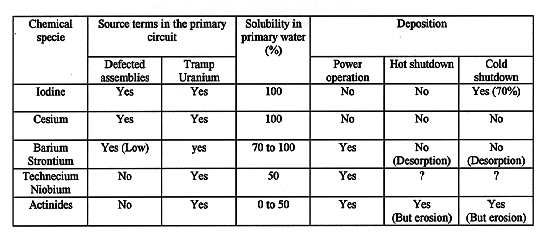 Variations due to the pH of the reactor water (e.g. cold shutdown) are also taken into account. Table I summarizes the considered behavior of the radionuclides in the primary circuit.