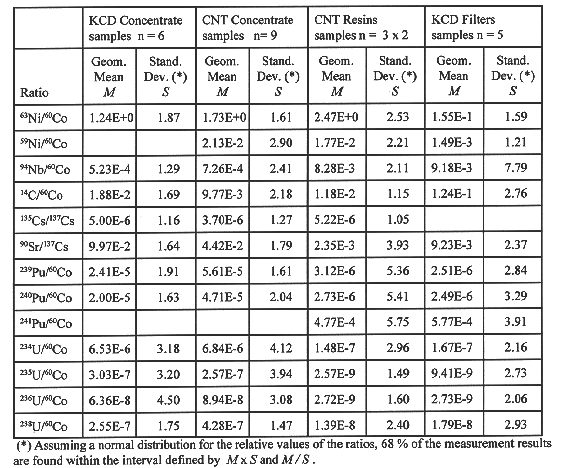 Individual measurements vary over a wide range as a result of specific reactor exploitation schedules and maintenance interventions during shutdown and refuelling. Therefor the results are presented as activity ratios with respect to a selected key nuclide. It is anticipated that the activity ratios will show a constant scaling factor or at least display a reproducible correlation. The results obtained for the power plant sites of CN Tihange (3 units) and KC Doel (4 units) are shown in Table I. Because individual results for specific ratios may vary to a considerable extent it was felt more appropriate to characterize the scaling factor as a geometric mean and to calculate the corresponding variance from their relative distribution around this geometric mean. This presentation provides a straightforward way to estimate the uncertainty associated with the use of the scaling factors when applied to individual waste streams and to judge the significance of differences observed between the individual waste streams, waste batches and NPP sites.