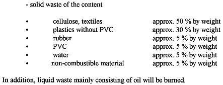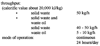In the incinerator the solid waste - more or less continuously conveyed - will be incinerated under sub-stoichiometrical conditions at a temperature of 900-1050°C. In the burning zone the waste will be transformed with air and steam into gaseous carbon hydrides, carbon monoxide, carbon dioxide and soot. This flue gas mixture will then be transported, together with the soot and unburnt particles, into the afterburner-chamber.