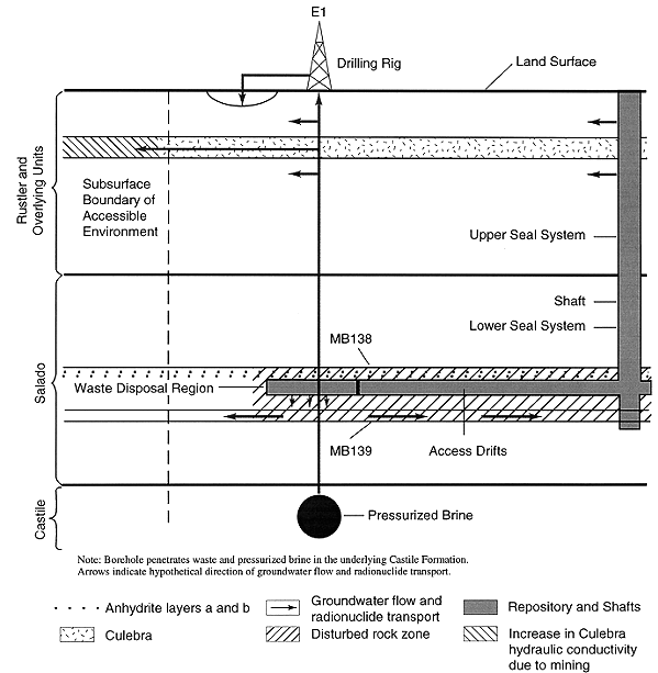 A repository disposal room intersected by a drill hole may be initially brine saturated and pressurized or the repository may be connected by the borehole to an underlying pressurized brine reservoir (Fig. 4). In either case the flow of brine up the borehole has the potential of reaching the surface during the drilling operation. The brine flow may carry dissolved actinides or remove solid waste to the surface. CCA modeling indicates prompt flow and direct removal of material due to drilling into an initially saturated room is the major contributor to radioactive release. Once the prompt release is stopped the hole would be cased and eventually plugged. The modeling assumes the plugs will eventually fail and allow brine to once more move up the hole--but now inhibited by material sloughed into the hole. The fluids may reach the Culebra but are not predicted to reach the overlying Dewey Lake formation or the surface. Drilling through a room into a brine reservoir does not contribute to prompt release because the fluid pressure balance is such that waste room brine cannot flow into the drill hole.