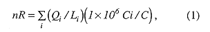 Qi = cumulative release in curies (Ci) of radionuclide i into the accessible environment during the 10,000-year period following closure of the repository. Li = release limit in curies for radionuclide i given in Table I. C = amount of curies of TRU waste emplaced in the repository. (TRU wastes contain alpha-emitting transuranic radionuclides with half-lives greater than 20 years.)