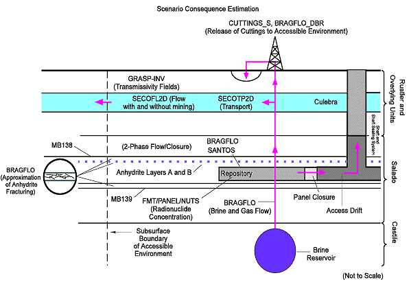 Figure 1 shows a method of visualizing how the various performance assessment codes relate to each other and to the estimation of scenario consequences. This figure represents a vertical cross section of the disposal system, associating the major codes with the particular components of the system each code simulates. As shown in the figure, BRAGFLO, SANTOS, NUTS, and PANEL address the Salado. GRASP-INV, SECOFL2D, and SECOTP2D address the Culebra. CUTTINGS_S, BRAGFLO_DBR, and PANEL address the immediate consequences of inadvertent human intrusion through one or more exploratory boreholes.