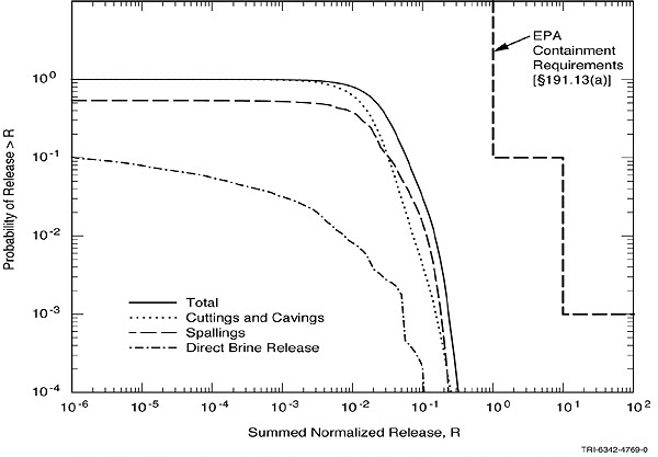 Figure 4 provides a display of the relative contribution of each mode to the total release. Releases for each of the three replicates are similar, and results are shown for replicate 1 only for simplicity. Mean CCDFs are shown for the total normalized release and for the normalized releases resulting from cuttings and cavings, spallings, and direct brine release. The mean CCDF for subsurface releases resulting from groundwater transport is not shown because those releases were less than 10-6 EPA units and the CCDF cannot be shown at the scale of this figure. Releases from cuttings and cavings are shown to be the most important contributors to the location of mean CCDF, with spallings also making a small contribution. Direct brine releases are less important, and have very little effect on the location of the mean.