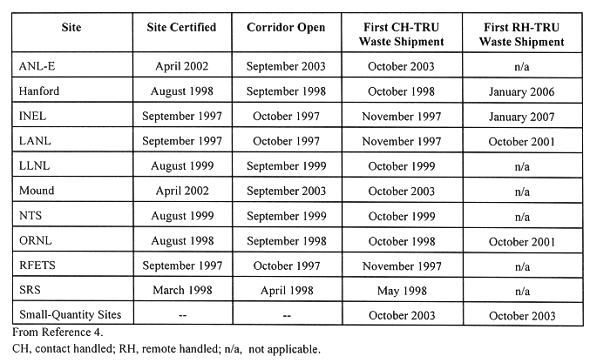 The WIPP is currently scheduled to begin receiving waste in November 1997 (4). To meet this schedule, the major sites are aggressively pursuing certification and transportation authority from DOE-CAO so that shipments of waste from their sites are not delayed.
