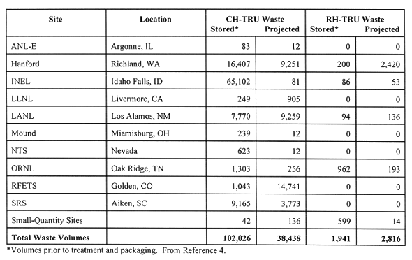 The currently estimated inventories of TRU waste by site are presented in Table III. The INEL has the largest inventory of CH-TRU waste and the ORNL has the largest stored inventory of RH-TRU waste. Hanford is projecting over 2,400 cubic meters of RH-TRU waste; however, this projection is uncertain.