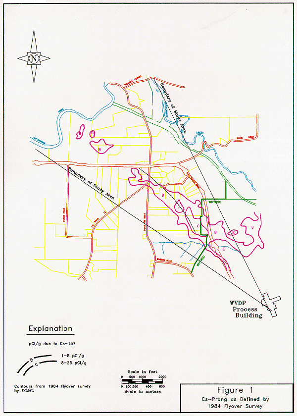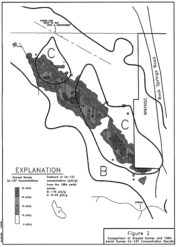 A surface soil sample taken northwest of the process building main stack and near the WNYNSC boundary in 1971 showed a radioactivity concentration of 2.14 Bq per gram (58 pCi/g) of Cs-137 (dry). In 1979, an aerial survey of the area surrounding the WNYNSC was performed that identified an area of gamma radiation slightly above detection level of .095 - .11 µSv/hr (9.5 - 11 µR/hr) to the northwest of the process plant and extending beyond the WNYNSC boundary (2). The elevated radiation levels outside the boundary of the WNYNSC were attributed to Cs-137 and contributed .014 -.024 µSv/hr (1.4 - 2.4 µR/hr) to the total gamma exposure in that area. Subsequent aerial surveys (Fig.1) confirmed the presence of the off-site area which, due to its shape and radioactive content, has been referred to as the "Cesium Prong" (3).