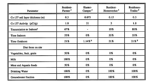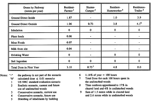 Values of the critical scenario parameters and corresponding doses are summarized in Table I. Upper bound doses, calculated with the RESRAD environmental transport and dosimetry computer code, indicated that: in current land uses, potential annual doses for the maximally exposed individual are below .05 mSv (5 mrem) in the current year; in future land uses, the most conservative scenario assumption (i.e., the scenario in which a residence house trailer is located in the 50m x 50m area with the highest Cs-137 contour) results in a projected annual dose to the maximally exposed individual below 0.08 mSv in the current year. Due to the radioactive decay of Cs-137 with a half-life of 30.2 years, annual doses in subsequent years will naturally decrease by 2.2 percent each year.