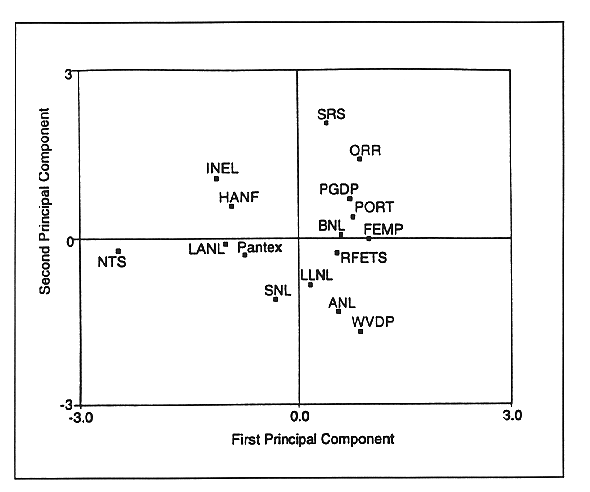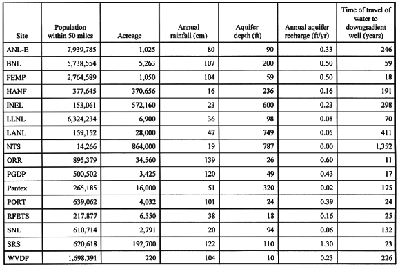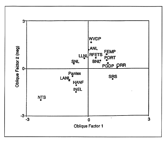Sites are plotted according to their scores on the first two oblique factors in Fig. 2. To provide a more understandable presentation of the rotated factors, the site scores on the second oblique factor were reversed (multiplied by negative 1) before being plotted in the oblique factor diagram. Sites to the right in the diagram have higher scores on the first factor indicating they have groundwater hydrologic conditions that would tend to move contaminants more quickly downgradient from disposal units and possibly to drinking water wells that might be used by the public. Sites to the left in the diagram are those where site hydrology tends to limit migration of contaminants and increase the time over which any movement might result in well water contamination. In terms of scores on the second factor, sites plotted in the upper portion of the diagram are those that are smaller in size with higher surrounding populations. Those plotted lower are the larger sites with lower surrounding populations. Land uses on and near the sites, the site size itself, and the size of the surrounding populations are more likely to change substantially during the time contaminants may be leaching from disposal units than the physical characteristics of the site. Therefore, DOE considers the first factor scores more important than the second factor scores in characterizing the sites' relative potential for offsite population risk.