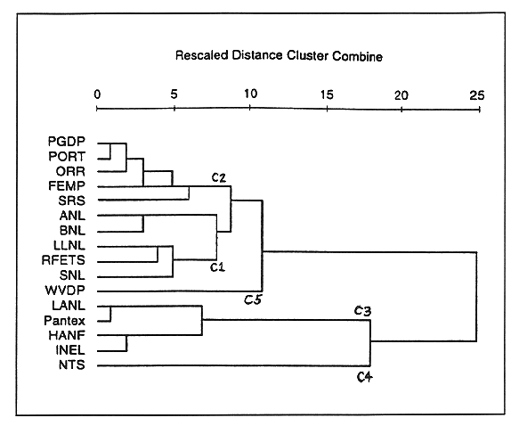 The factor analysis gives a general indication of the population risk vulnerability relationships of the 16 proposed disposal sites. The factor scores of the 16 sites show relationships among the sites in hydrologic and population characteristics that would be reasonable to conclude would be directly related to the levels of population dose and risk. However, to identify distinct groups of sites representing similar levels of potential for population risk from waste disposal, the sites were grouped using a cluster analysis of the same six site characteristics. A dendrogram (Fig. 3) illustrates the partitioning of the sites into an increasing number of clusters based on the squared-Euclidean distance method applied to the standardized variables. The first five clusters derived were used in the population risk vulnerability analysis. The first cluster developed, reading the diagram from right to left, splits off Hanford, INEL, LANL, Pantex, and NTS from the remaining 11 sites. The next extraction splits NTS (Cluster 4) from Hanford, INEL, LANL, and Pantex (Cluster 3). A third extraction separates WVDP (Cluster 5) from the remaining 11 sites and a fourth extraction divides FEMP, ORR, PGDP, PORTS, and SRS (Cluster 2) from ANL, BNL, LLNL, RFETS, and SNL (Cluster 1). Sites are arrayed by their cluster number in Fig. 4.