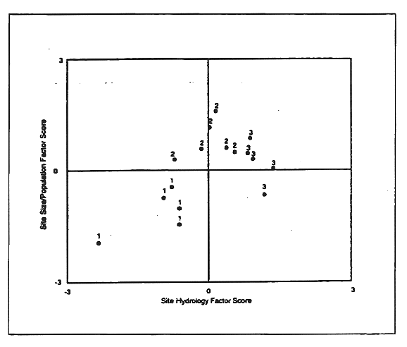 The first principal component derived in the analysis (Table IV) accounts for approximately 64 percent of the variability, or information content, in the site environmental characteristics data. It is a vector that substantially measures all seven variables--the absolute values of the loadings exceed 0.5 for all variables. It can be interpreted as accounting for the fact that the smaller sites are generally the sites with higher regional populations and with wetter hydrologic conditions. These conditions include higher rainfall, a generally shallow water table, and a relatively short groundwater time of travel. The second principal component accounts for an additional 15 percent of the data variability, but is not as readily interpretable. (The sites are plotted according to their scores on the first two principal components in Fig. 1.) Therefore, factor rotation was performed in an attempt to derive factors that could be more satisfactorily interpreted.