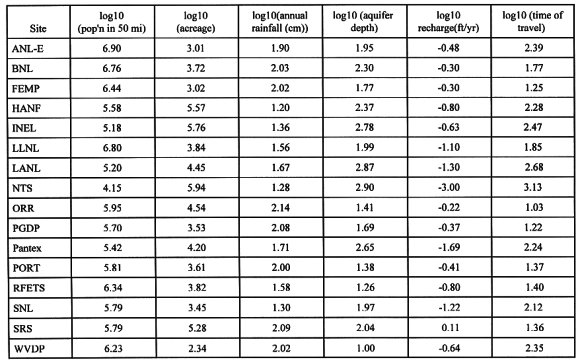 The variables chosen to be used in the factor and cluster analyses of the 16 candidate disposal sites were six site characteristics considered likely to cause, or be strongly associated with, future levels of offsite population risk from radioactive or mixed waste disposal: annual rainfall, annual groundwater recharge, aquifer depth, travel time of water from the time it infiltrates the ground surface to the time it reaches the aquifer and appears in a downgradient well, current human populations within 50 miles of the site, and site acreage (Table I). The first three variables, which characterize the surface and groundwater hydrology of the sites, are measures known to determine the speed, duration, and extent of dispersal of contaminants from disposal facilities and the level of resulting downgradient concentrations in groundwater. The travel time estimates are based on the physical properties of the soils, the aquifer depth, and the groundwater velocity at each site. Current population levels are considered the most appropriate measure of the potential size of the population at risk in the near term, at least on a relative basis from site to site. Site acreage provides an indirect measure of two associated characteristics--the size of the potential populations at risk and the likelihood that contaminants in downgradient groundwater would appear in a publicly accessible well water source; the former because the larger sites exclude population growth on extensive areas, the latter because of the relationship between the proximity of offsite population centers to locations on the sites where disposal facilities would be constructed. Data on annual rainfall, aquifer depth, current human populations within 50 miles of the site, and site acreage were taken from ORNL (1995). Estimates of time of travel were made using environmental setting data on unsaturated and saturated soil zones for the 16 disposal sites provided in ORNL (1995). Data on annual groundwater recharge was taken from SNL (1996). These site characteristics are generally strongly correlated with each other--for example, the smaller sites tend to be situated in regions of denser population with higher rainfall. Therefore, it was expected that the seven variable measures could be represented by a limited number of principal factors that are composite measures of the important variations in the site characteristics.
