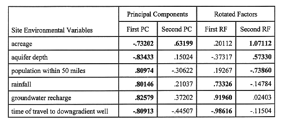 The factor rotation technique selected for the analysis, oblique rotation, produces more easily interpretable factors in this instance although the factors are not independent. The first two oblique factors (Table IV) can be interpreted as (1) a site hydrology factor that is positively loaded on rainfall and groundwater recharge and negatively loaded on time of travel of water to a downgradient well, and (2) a general site characteristics factor that might be described as the "small, shallow water table, high population" factor. The factors have a correlation of -.58603 ; sites that have higher scores on oblique factor 1 tend to have lower scores on oblique factor 2.