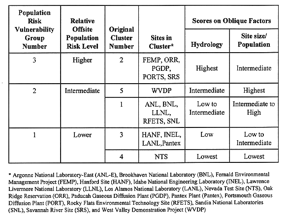 The cluster analysis was used to identify three general site groups according to their expected relative population risk vulnerability. The single-site clusters (4 and 5) were combined with their nearest neighbor clusters. The resulting groups were renumbered to indicate higher (PRV Group 3), intermediate (PRV Group 2), and lower (PRV Group 1) relative population risk vulnerability. The groups are listed with the basis of the PRV grouping in Table 5.