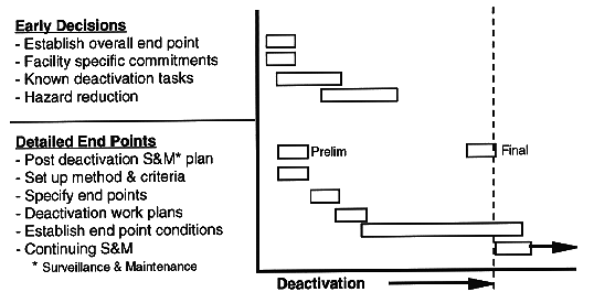 In general, for complex facilities with a multitude of structures, systems, and components, deactivation implementation occurs in at least two phases. Fig. 1 illustrates this point. The first phase deals with strategic issues and can be referred to as "early decisions." The second phase addresses details of the final condition and can be referred to as "detailed end points." The importance of this two phase view is that most major decisions should be made early while decisions on final conditions for individual areas of the facility can be made somewhat later. Indeed, early decisions will often be necessary before the latter can be specified.