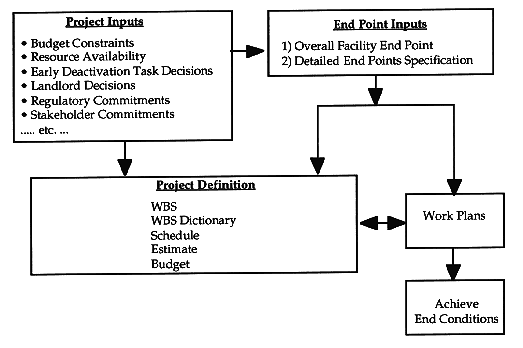 A policy requirement for facility deactivation is that the management approach must be transformed to a project management structure from a production (level-of-effort) facility operation. Fig. 2 illustrates the relation of end points specification to other deactivation project management tasks. Specifying end points are an integral part of deriving the project work breakdown structure, schedule, and budget. While preliminary projections can be created, sufficient data for budgeting will only be available when work planning is conducted with an explicit set of area, equipment, and documentation goals.