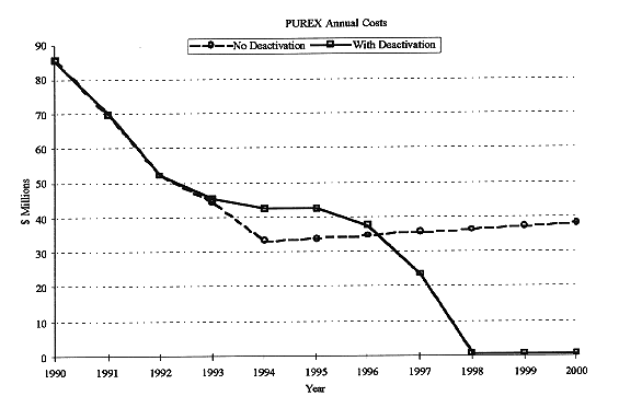 Figure 5 shows the cost history and projection for PUREX, a deactivation project where much of the methods reported here were pioneered. It is seen in this figure that between 1993 and 1996, the spending rate was greater than had operation of the facility continued without change. However, substantial cost avoidance will be realized by the time deactivation is complete by the elimination of substantial annual costs and a low S&M budget. In this case, payback for the 1993-1996 incremental investment will be realized before the completion of deactivation in 1997.