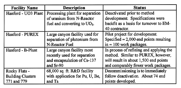 Just as the design specifications are essential to a construction project, specifying end points is the key to answering this question for a deactivation project. Compiling end point specifications for the entire facility has the following uses during and/or after implementation: