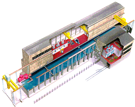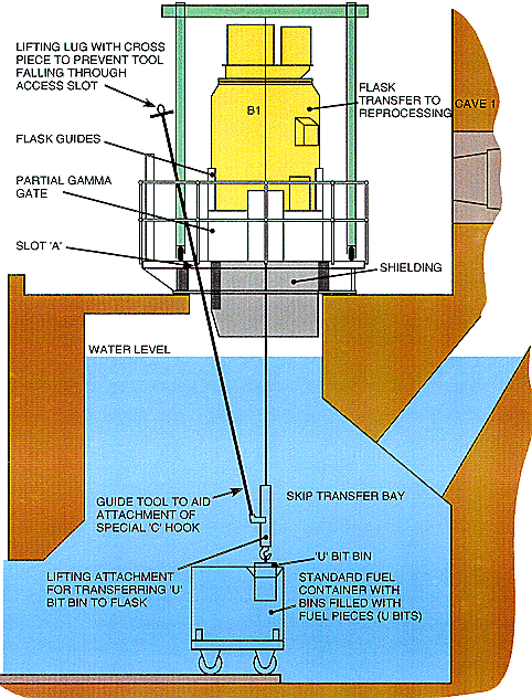 The Original Magnox Fuel Storage and Decanning Plant (Fig. 1) operated for 26 years and processed over 25000 tonnes of fuel. It was taken off-line in 1986 when new facilities were commissioned. During operation solid radioactive waste was stored locally in concrete silos (Fig. 2) whilst in the plant there accumulated residual and damaged fuel (1000te), sludges (2000m) and debris (500m). In 1993 the silos contained 8000m of miscellaneous waste stored underwater. Working conditions within the plants were difficult due to high levels of radiation and contamination.