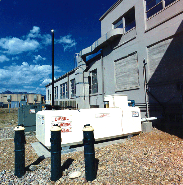 The decision was to use ASTs for all 18 of the diesel fuel emergency generator tanks. There was adequate space at all sites to accommodate the AST and avoid the concerns with excavation for a UST. A typical AST installation is shown in Fig. 2. Five new USTs were installed at the RFETS vehicle fueling facility. There was not adequate space for ASTs; however, space was available for USTs, and there were additional regulatory requirements for ASTs used for vehicle dispensers.