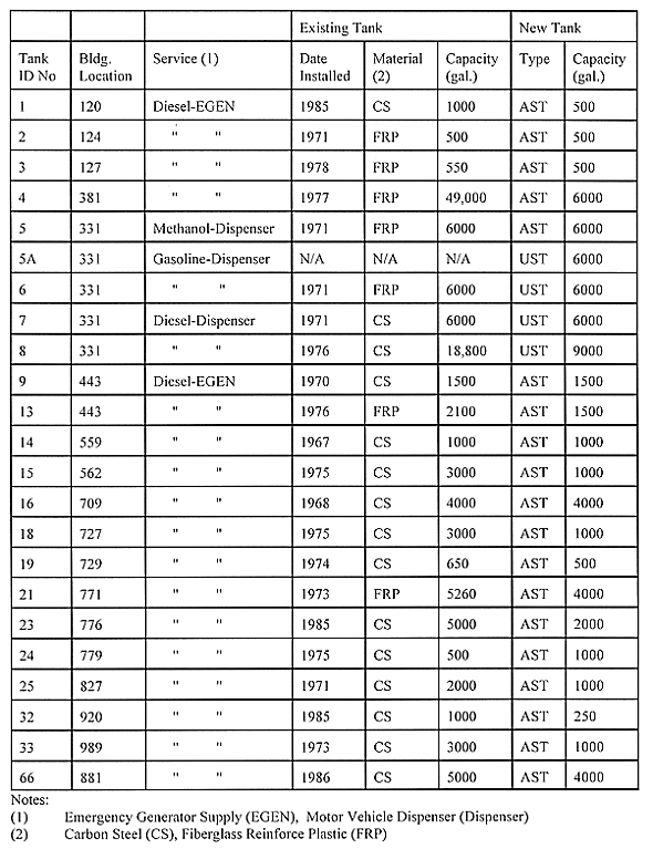 Originally there were 22 USTs used for fuel storage that served emergency power generators or vehicle refueling at RFETS. In order to meet Federal and State regulatory requirements for leak detection and spill prevention, a project is underway to replace these USTs. A pilot project was completed in 1995 to replace three of the tanks. The project to replace the remaining tanks is in progress and will be completed in 1997. The regulatory deadline for replacement or upgrade is December 1998. The existing tanks range from 500 to 49,000 gallons, and are constructed of carbon steel or fiberglass reinforced plastic (FRP). All of the existing tanks have been tightness tested and are not known to leak. A summary description of the tanks is provided in Table I.