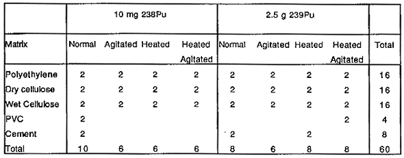 Sixty gas-tight, 1-liter containers were loaded with different waste matrices together with 238Pu and 239Pu oxide powders. The sixty containers are divided among four racks that expose the containers to four different environmental conditions that might be encountered in the TRUPACT-II. These include heating at 60°C and/or agitation that will simulate the expected road vibrations enroute to WIPP. The contents of the 60 containers and the environmental conditions they are exposed to are presented in Table I.