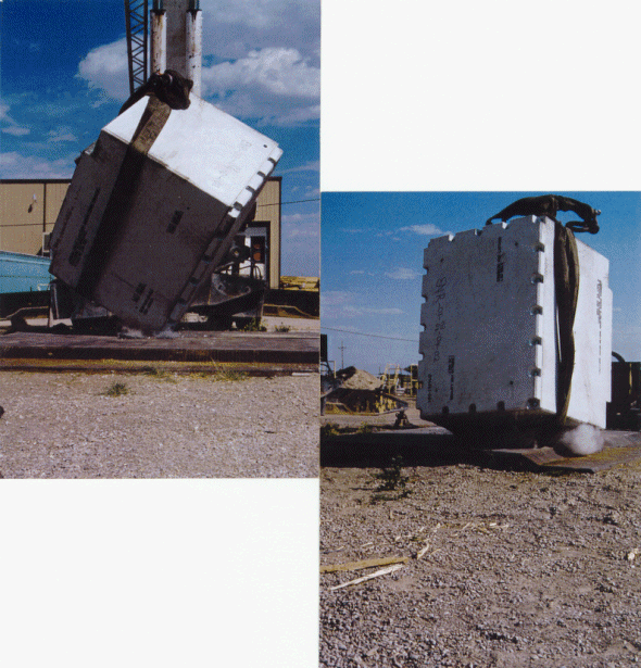 The first activity to be implemented was to test the packaging for compliance to DOT requirements for packaging ability to withstand the dynamic effects of transportation. Prior to being loaded onto the transport truck, one prototype was loaded with a content configuration simulating that of the intended content of vitrified "gems" of K-65 silo material. The mock content, consisting of standard gravel and a mixture of embedded concrete panels was introduced into the packaging so as to create a package gross weight of 21,000 pounds. The gasket seal was installed, the lid placed onto the container and all lid bolts installed or in accordance with the testing specification. Following this procedure all prototypes were shipped to SEG Carlsbad Facility for testing.